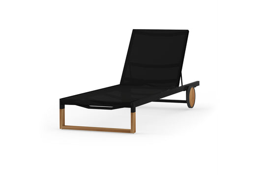 EKKA Lounger, Aluminum Black, Plantation Teak Smooth Sanded Teak Shield, Twitchell Royal Black